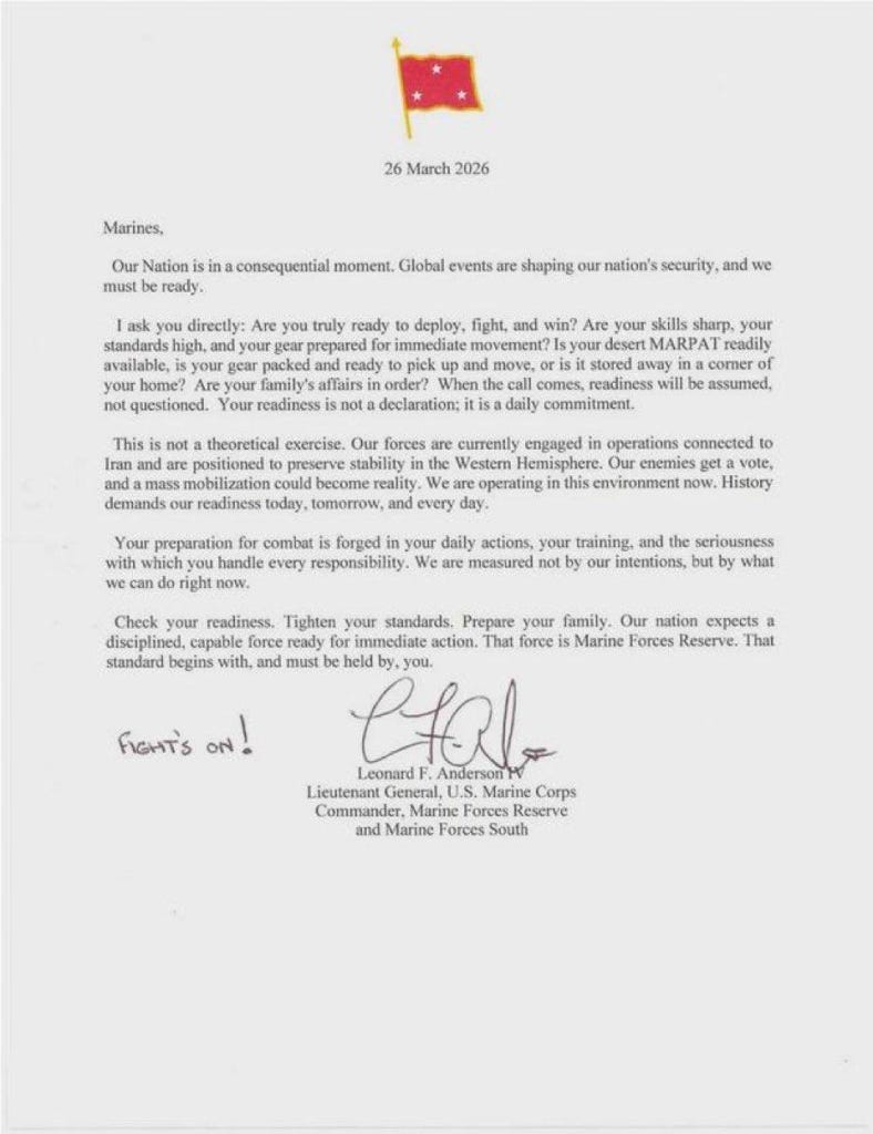 What are we to make of the letter? Is this is a clever move by the Commander of the Marine Forces Reserve to protest sending the Marines to conduct a ground operation in Iran, such as seizing Kharg island. Or is it an officer eager for promotion pontificating in hopes of capturing Trump’s attention?
